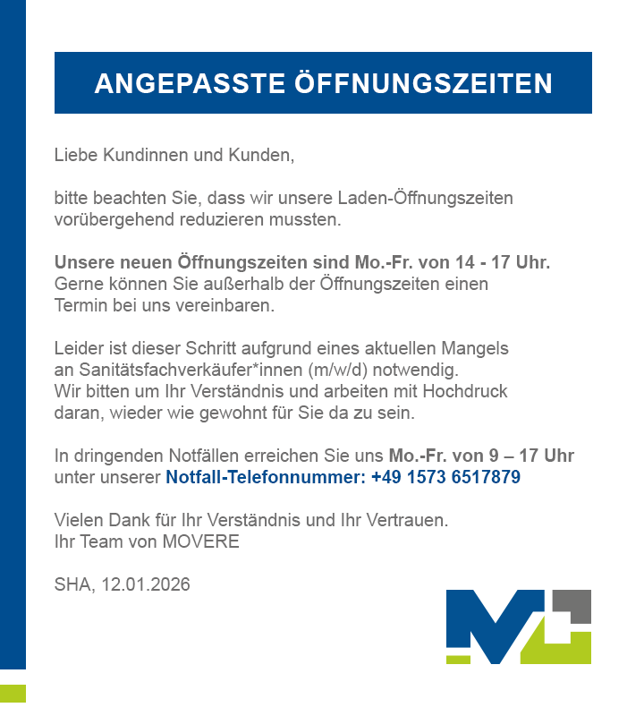 Für Ihre Gesundheit und Mobilität legen wir uns ins Zeug. Bei MOVERE bekommen Sie eine kompetente Beratung und die richtigen Hilfsmittel für Ihren Alltag. Ob präventiv oder wiederherstellend – unsere Lösungen für Sie sind ganzheitlich und individuell an Ihre Bedürfnisse angepasst.