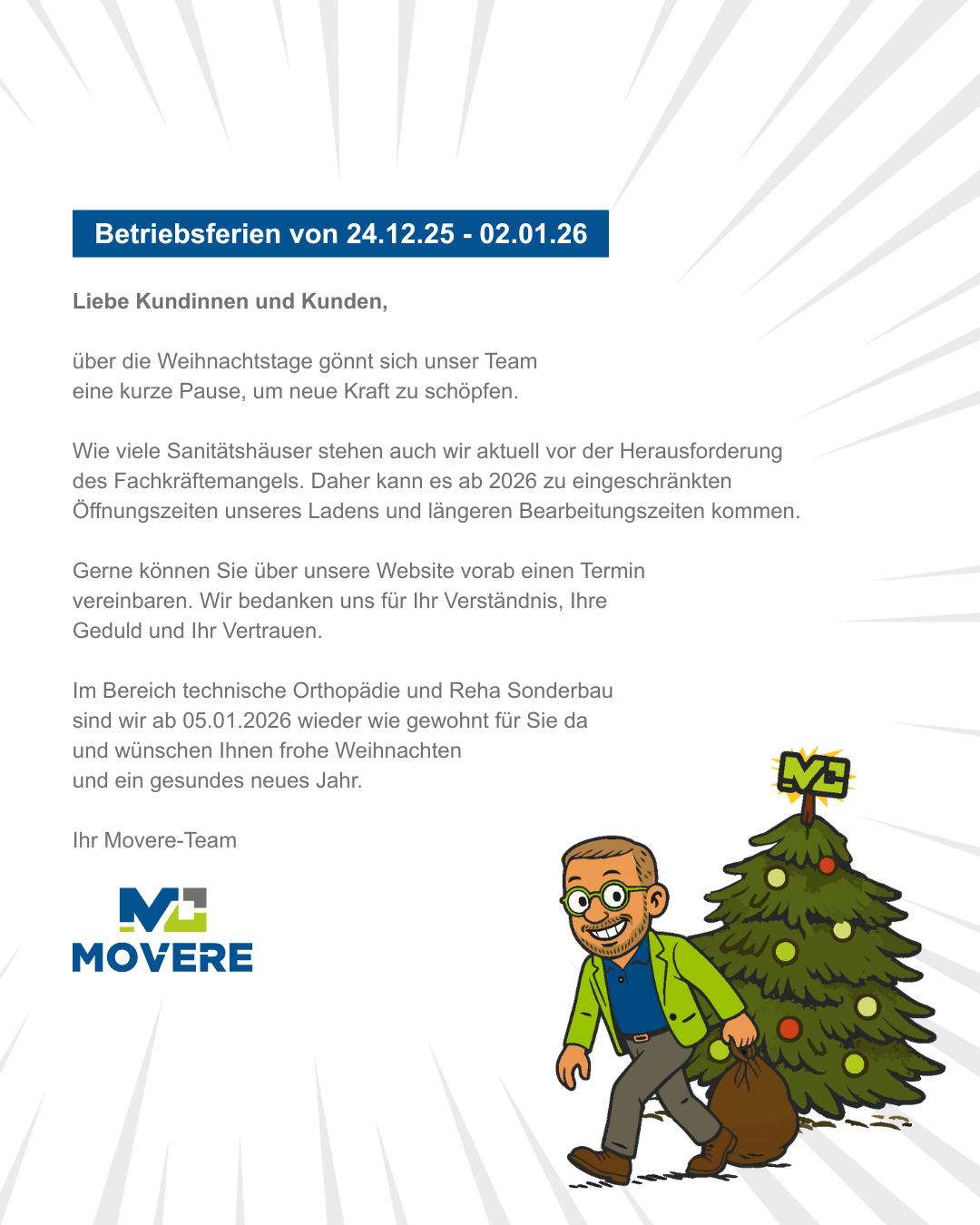Für Ihre Gesundheit und Mobilität legen wir uns ins Zeug. Bei MOVERE bekommen Sie eine kompetente Beratung und die richtigen Hilfsmittel für Ihren Alltag. Ob präventiv oder wiederherstellend – unsere Lösungen für Sie sind ganzheitlich und individuell an Ihre Bedürfnisse angepasst.